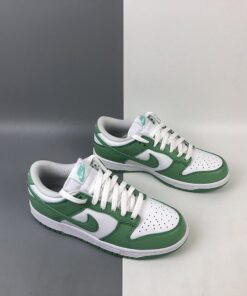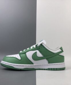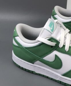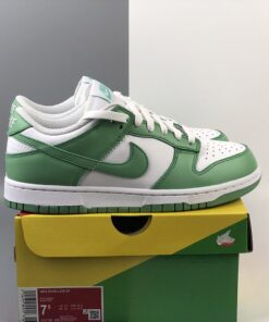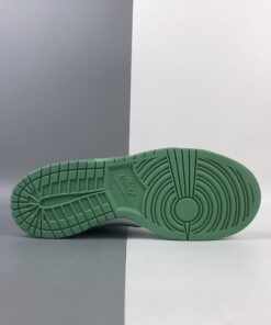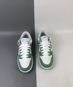 This offering of the Nike Dunk Low features a White leather base with Green Glow overlays, Swoosh logos and rubber outsole. White continues on the inner lining, laces, and midsole to complete the design.