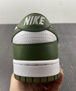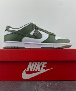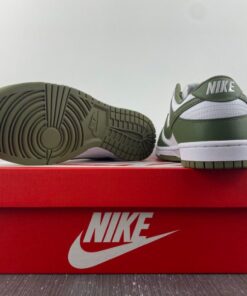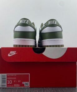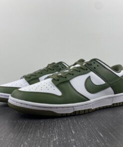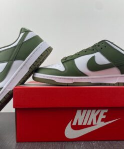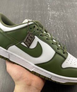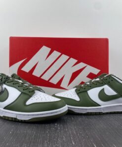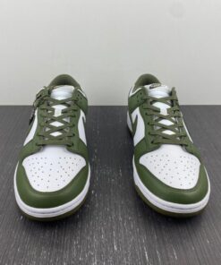 Dressed in a White and Medium Olive color scheme. This offering of the Nike Dunk Low comes constructed in a full leather build with mesh, nylon tongues and sockliner. White embroidered branding on the heels and colored midsole atop a Medium Olive rubber outsole completes the design.