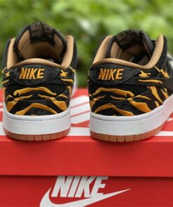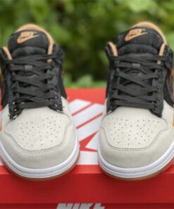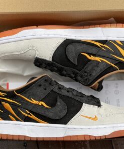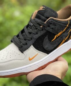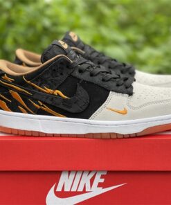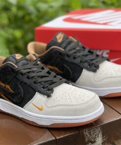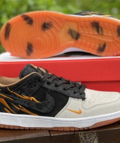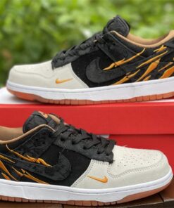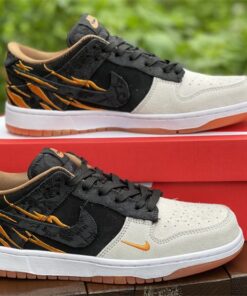 Said to be a grade-school exclusive colorway of the model, this Dunk Low comes dressed in a Black suede base paired up with Grey suede on the toe area. The split-colored motif is then decorated with embroidered tiger stripes throughout the heels, satin liners and a Golden mini Swoosh on the lateral toe mudguard. If you take a closer look, you will spot tonal Asia-inspired designs on the eyestays, overlays on the ankle and Swooshes. Completing the look is a White midsole atop an Orange translucent outsole covered in Black spots that pay tribute to the tiger.