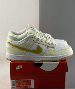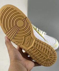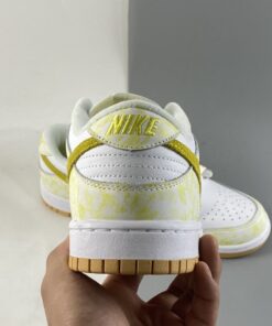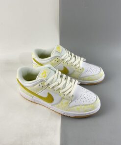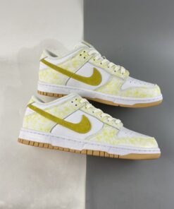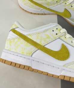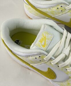 Dressed in a Yellow Strike and White color scheme. This Nike Dunk Low features a White leather upper with an acid wash-like finish on the overlays and tongue label. Yellow suede Swooshes, branded tongues and heels, insoles and pastel rubber outsole atop a White midsole to complete the design.