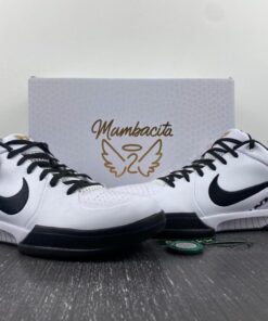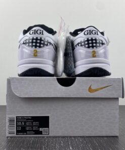 The Nike Kobe 4 Protro “Gigi” celebrates Gigi Bryant’s birthday. Flipping the color scheme of 2022’s Kobe 6 Protro “Mambacita,” the Nike Kobe 4 Protro “Gigi” is dressed almost entirely in white.. Standout details on this pair include a black plaid print on the heels, “GIGI” embroidered on the heels along with with her jersey number “2” in gold, black embroidered Swooshes on the side panels, and gold Kobe logos on the tongues. Split midsoles and black rubber outsoles wrap up the look