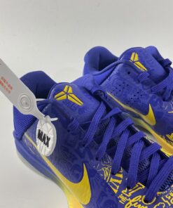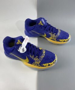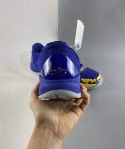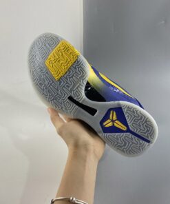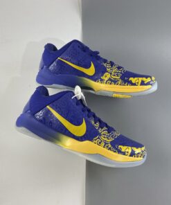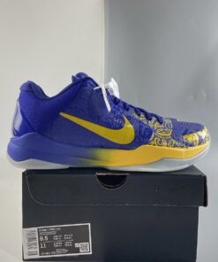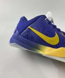 This offering of the Nike Kobe 5 Protro features a Purple-to-Yellow upper detailed with laser-etched verbiage spelling out “Five Rings.” Yellow Kobe tongues and Swooshes on the sides atop a gradient midsole and translucent outsole completes the design.