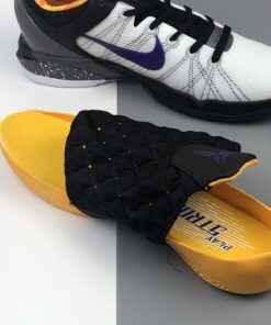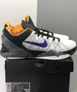 Kobe Bryant laced the Nike Zoom Kobe VII System White/Court Purple up on opening day of the NBA 2012-2013 season and even though they may have not helped him get a victory; they do drop tomorrow. Featuring a White base with Court Purple and Black accents with speckled midsoles and University Gold detailing.