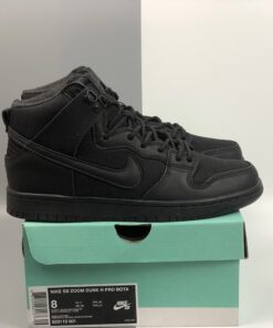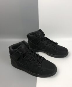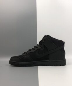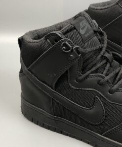 Dressed in a Triple Black color scheme. This Nike SB Dunk High comes with weather resistant material with a combination of suede and ballistic nylon are combined with a warm wool sock liner.