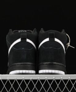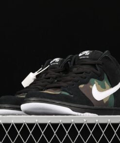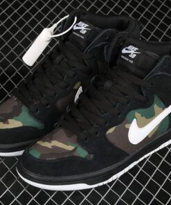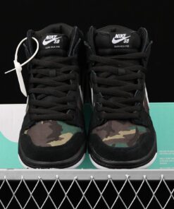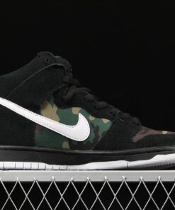 This Nike SB Dunk High features a premium Black suede overlay with camouflage canvas on the sides and toe. A White branding on the tongue, Swoosh logo and rubber outsole completes the design.