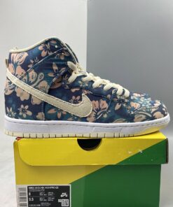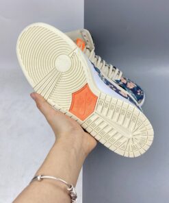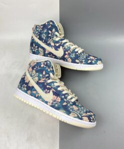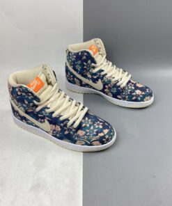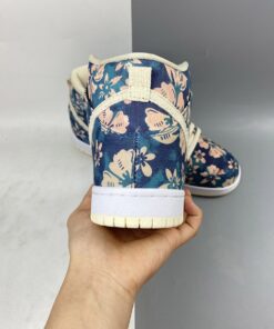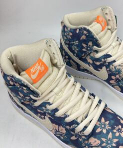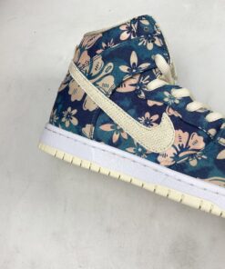 Dressed in a Sail, Blue, and Green Aqua colors scheme. This Nike SB Dunk High features a wear-away floral print that reveals a shaggy Green suede underneath, as well as the hidden stash pocket. Bright Orange tongue tags atop a White midsole and Sail rubber outsole completes the design.