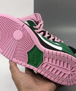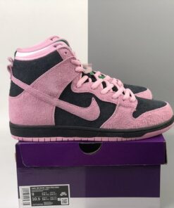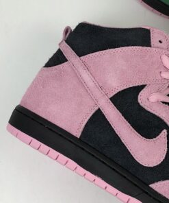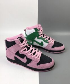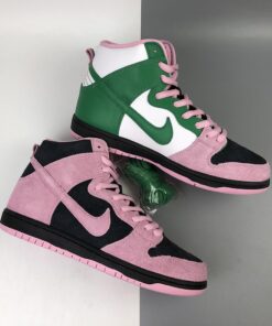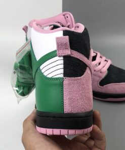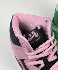 this Nike SB Dunk High comes dressed in a Black, Pink Rise and Lucky Green color combination. Pink and Black suede lands on the lateral side and toe box while Celtics’ Green and White leather lands on the medial side. When you take a picture with your camera or phone and invert the colors, you will see the colors flipped.