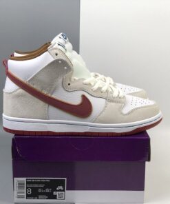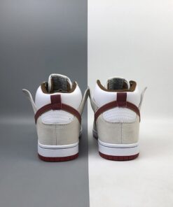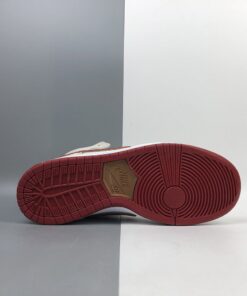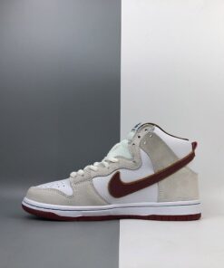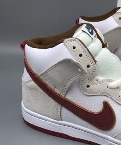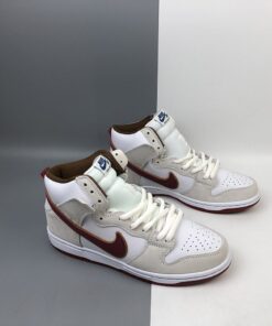 This offering of the Nike SB Dunk High comes dressed in a Sail, Wheat, and Team Crimson color scheme. It features a tumbled leather upper paired with suede overlays, mesh tongues and Crimson Red accents on the liner, Swooshes, heel tab and rubber outsole.