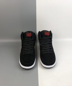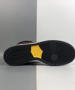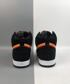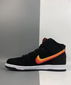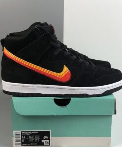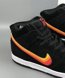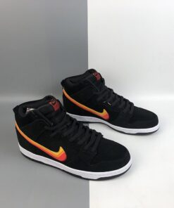 As we already mentioned that this silo is a callback to the road trips of vintage 70s and the RV decorations, the details are almost done. But the Nike Swoosh on the sidewall changes the game with its quad-layer colours to imitate the sunset scenery! You can also recall the RV stripes because of it. The fiery orange and yellow colour-pops on the leather Swoosh and the tongue label are the only accents in this high-top. Finally, the tonal black velvety suede body sits on a white SB Dunk midsole and black outsole.