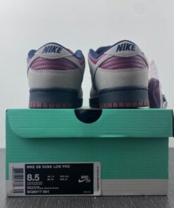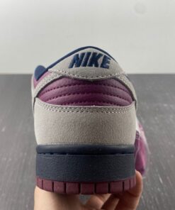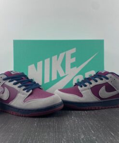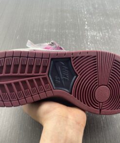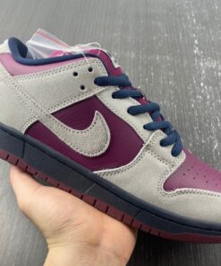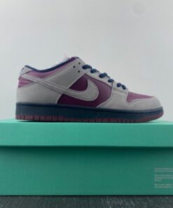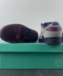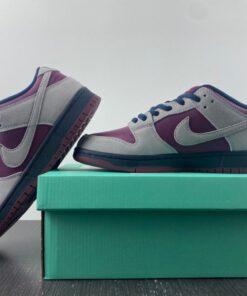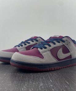 A SB Dunk Low, dressed in maroon and grey. The upper’s panels are constructed of a stately maroon leather, while rough stone grey suede appears on the overlays and Swoosh, providing street-ready embellishments. Dark navy then arrives on the laces, collar, and midsole to offer a finishing touch of contrast.