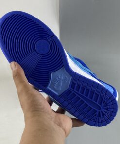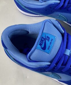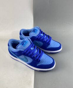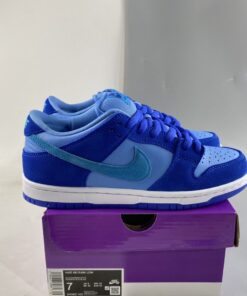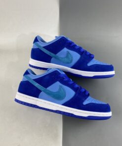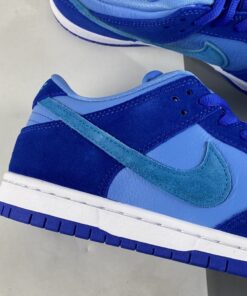Dressed in a Racer Blue, Laser Blue, University Blue, and White color scheme. This Nike SB Dunk Low features a leather base, suede overlays and Swooshes with mesh used on the tongues. An illustration of a stoned Blue Raspberry with two different facial expression appears behind the tongue tags. A White midsole atop a Blue rubber outsole completes the design.