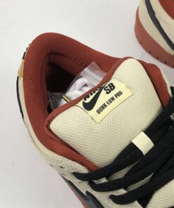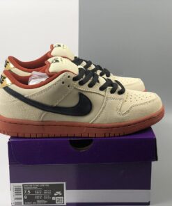 This offering of the Nike SB Dunk Low features a Cream leather and suede upper paired with Black covering the Swooshes, laces, and branding on the tongues and heels. Gold heel tabs atop a Rustic rubber sole completes the design.