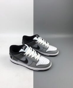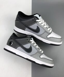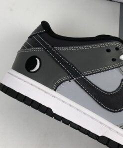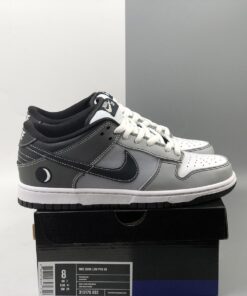 They feature lighter shades of toned grey, accented by black on the swoosh and outsole. The heel contains a moon shown on the west side.