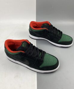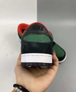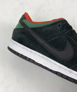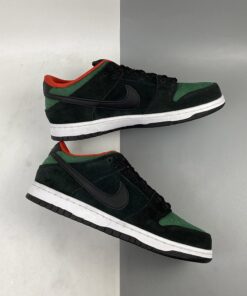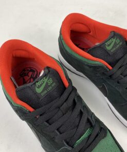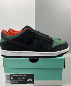 they come in a recognizable black, gym red and gorge green colorway. It sports a black-based suede upper with croc skin detailing on the toe and wrapping around the heel. Custom printed insoles depict a “Creature From The Black Lagoon” reference with a monster-like hand reaching up out of the water, grabbing a snake. A leather Swoosh, red liner and puffy tongue finish these SB’s off.