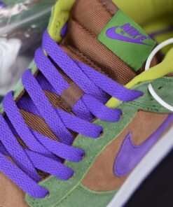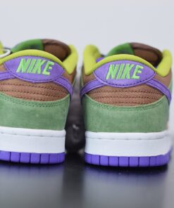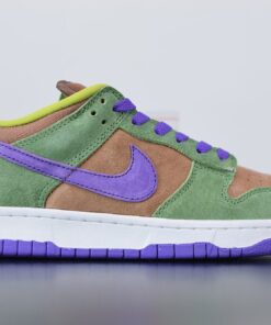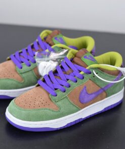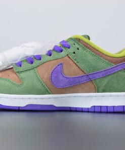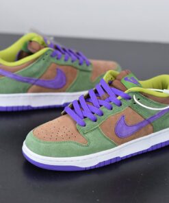 Dressed in a Veneer, Autumn Green, and Deep Purple color scheme. This Nike Dunk Low will stay true to the original, featuring a premium suede upper with a Brown base, Green overlays and Purple accents atop a White midsole.
