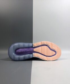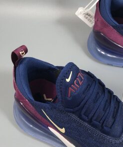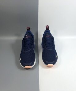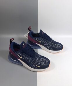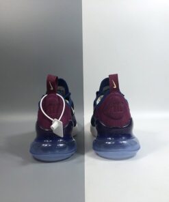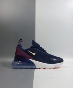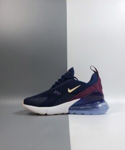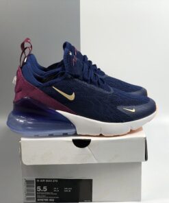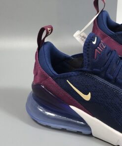This Nike Air Max 270 features a Navy Blue upper with a bold Burgundy heel wrap. Light Peach accents appear on the Swoosh logos and heel tab, while Purple hits are sued on the “270” logo, tongue label and outsole. A White midsole atop a clear Air Max heel unit completes the design.