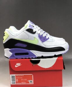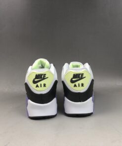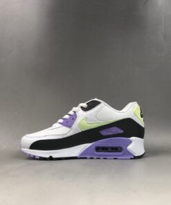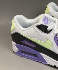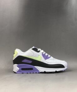 Dressed in a White, Barely Volt, and Black color scheme. This Nike Air Max 90 features a White mesh upper with leather overlays paired with Black tumbled leather on the mudguard. Highlighting the shoe are Volt and Lavender contrasting accents.