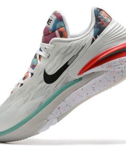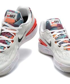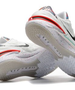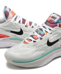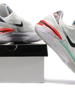 Code named “Leap High” for its typography on the informational factory-like tongue tab, a crisp white base layer illuminates the overall composition, allowing for its inclusion of disparate and titular hues to reign supreme. Extending a thin strip of teal at its forefoot, the lower section of the molded heel counter encourages a bright red trim surrounding the latter’s tucked away inclusion. Coordinating the hues of the pair into a speckled arrangement along the midsole, a jet-black Swoosh interjects at the midfoot before an abstract amalgamation of basketball motifs and vivid colors fill the tongue construction and perforated heel tab.