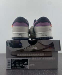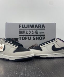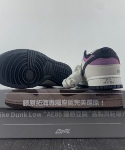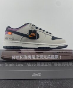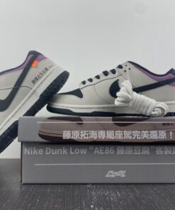 Taking elements from the Toyota Sprinter Trueno AE86 that served as the delivery car for Fujiwara Tofu Shop, the Dunk Low concept features black and white leather uppers with a purple panel on the heel and an orange tag on the end of the Swoosh resembling the car’s blinkers. The shop name is printed in Japanese on the lateral heel counter, and the license plate is etched in green on the rear of the white midsoles. Classic black rubber outsoles complete the tribute design.