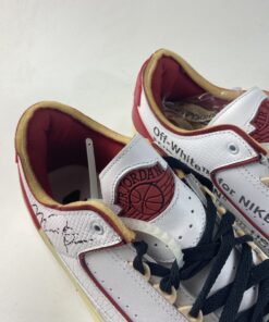 Furthermore, the midsole will come with an aged look and features a design that makes the midsole appear cracked. While it’s rare to see an original Air Jordan 2 pop-up on auction sites, most of the time, they feature a cracked sole. Some of the other highlights include Off-White branding, ‘SHOELACES’ written on the laces, and an exposed foam tongue and liner. Finally, Michael Jordan’s signature lands on the lateral side, and Off-White branding adorns the medial.
