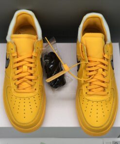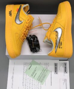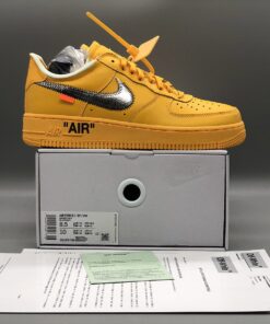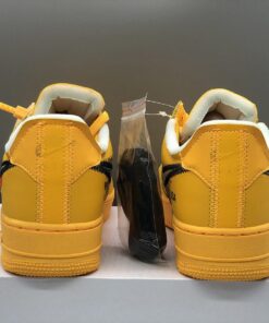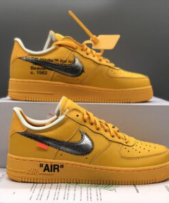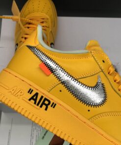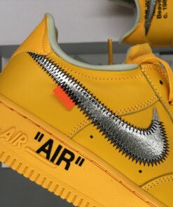 Dressed in a University Gold and Metallic Silver color scheme. This Nike Air Force 1 features a University Gold base with Silver Swooshes completed with signature Off-White branding and detailing throughout.