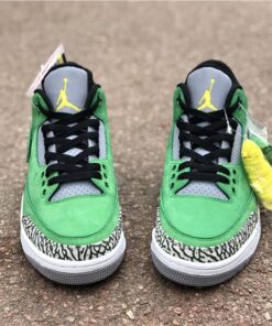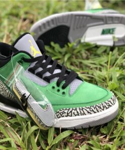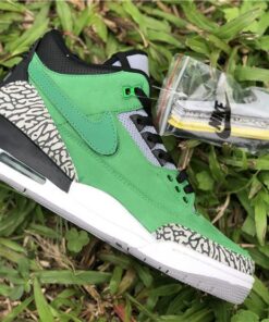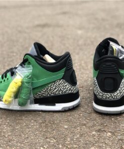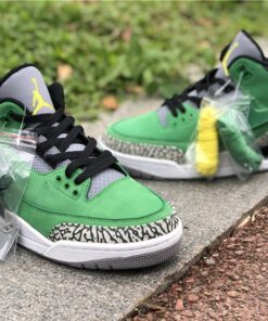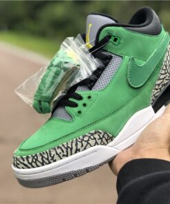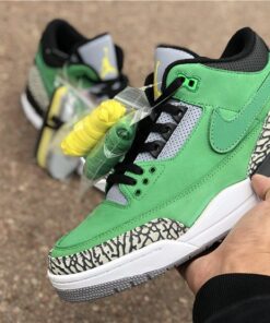 Dressed in the Ducks’ school colors. This Air Jordan 3 features a Green suede upper highlighted with removable Swoosh patches in Black and Yellow leather. An oversized “O” logo is seen on the heels, while having Oregon x Jumpman logos on the insoles.