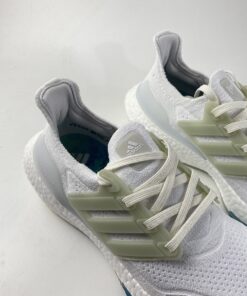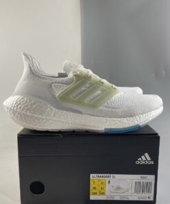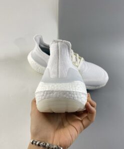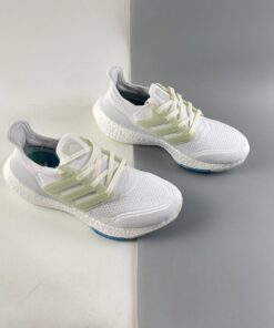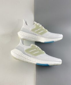 this adidas Ultra Boost 2021 comes constructed with Primeblue, a high-performance recycled material made in connection with Parley Ocean Plastic. 50% of the upper is textile, and 75% of the textile is Primeblue yarn. Lastly, we have White across the uppers while the same shade appears on the Boost midsole to finish the look.