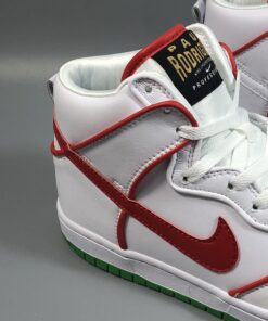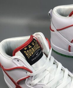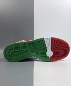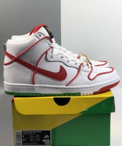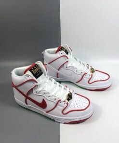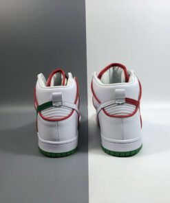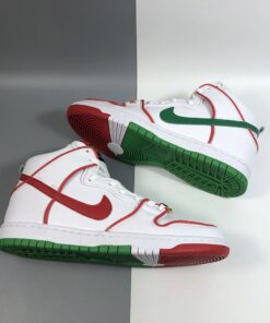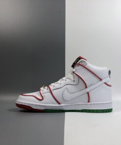 The details on this Nike SB Dunk High collab nods to a famous pair of Mexican boxing gloves from the tongue tag, to the championship belt lace locks. It features a White leather upper contrasted with Red and Green accents throughout. Boxing glove insoles, Mexico’s colorful flag represented on the outsole and a set of flat laces completes the design.