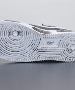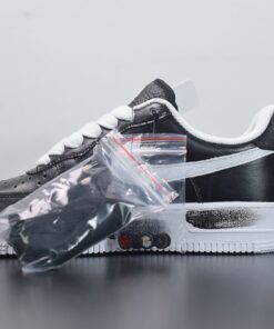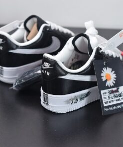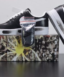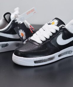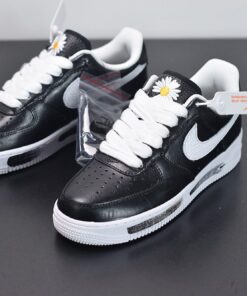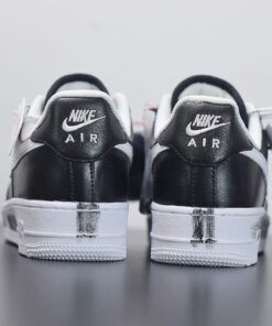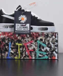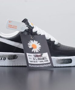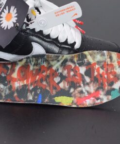 Getting a better look at the low cut sneaker we see that the premium leather upper features a cracked black exterior that reveals hits of color hidden under. Contrasts comes in the form of white Swoosh branding, embroidered daisy motifs at the tongue, branded thick laces and a white lining. We also get a look at the printed insoles which express a graffiti-inspired print centered around a large daisy motif and dripping text. Finally, the haphazardly applied strokes of black paint not only appear on the side of the contrasting AF1 sole units but also on the bottom.
