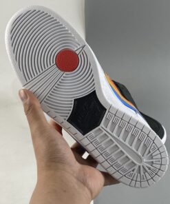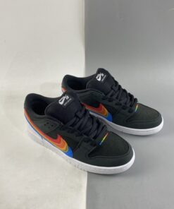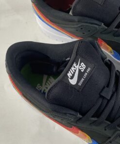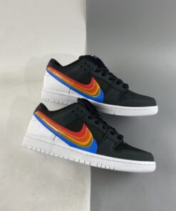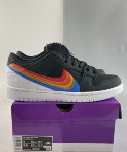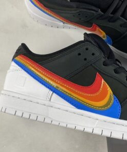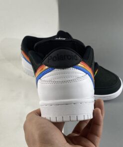This offering of the Nike SB Dunk Low features a Black leather base with White appearing on the branded tongues, heels, and rubber sole. Highlighting the shoe are its Rainbow Swooshes on the sides nodding to the Polaroid logo. Co-branded laces tips, heels, and multicolored insoles completes the design.