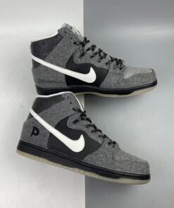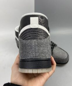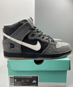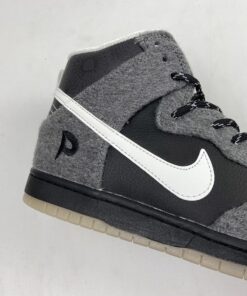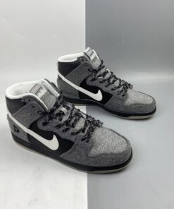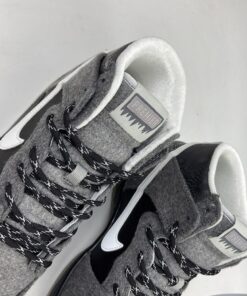The sneaker features a Dark Grey wool upper accompanied by Leather accents and Reflective material. Featuring a snowflake like reflective design on the heel, the Blue icy sole completes the sneaker’s theme.
