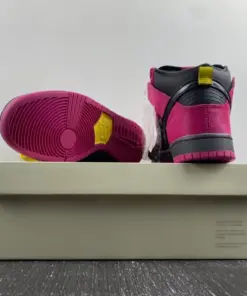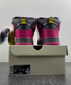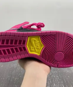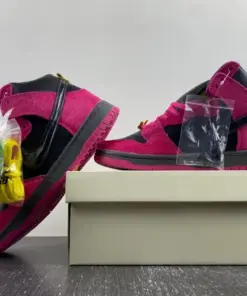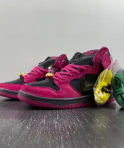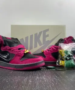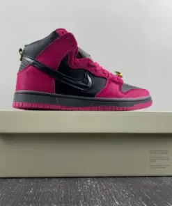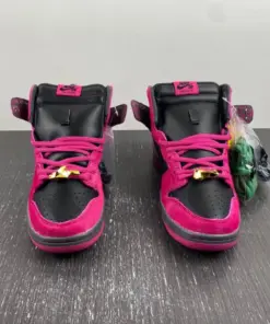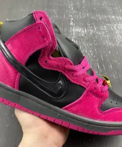 Dressed in an Active Pink, Black, and Metallic Gold color scheme. This offering of the Run The Jewels x Nike SB Dunk High features a Black tumbled leather upper with Fuchsia-colored pony-hair overlays, jewel-styled Swooshes, Black and/or Metallic Gold lace dubraes. Hidden details includes a “Run The Jewels” print inscribed on the inside of each collar flap and a stash pocket on the interior tongue. A Black midsole atop a Fuchsia rubber outsole completes the design. The shoe will also come with extra set of laces housed in signature Nike SB packaging.
