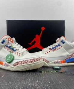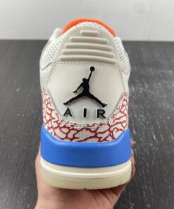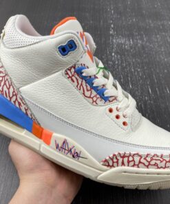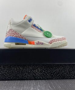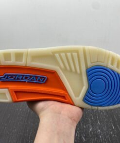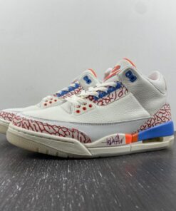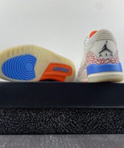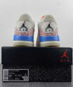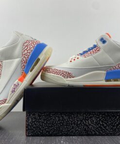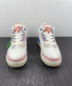 this Air Jordan 3 features colors reminiscent of the Oklahoma City Thunder. Utilizing White tumbled leather on the upper and his stats along the smooth leather mudguards. Next, we have perforations on the collar and tongues, ‘Why Not’ printed on the lateral midsole, while Orange and Blue detailing adorns the elephant print around the toe and heels. Other details include Westbrook’s logo on the tongues, Jumpman logos on the heels and insoles, and a translucent outsole.