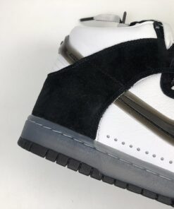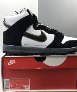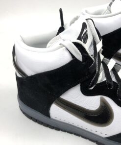 the Nike Swoosh on the sidewall will take away your attention. It’s glossy with a milky chrome shade. It’s a gummy Nike Swoosh that almost looks animated. This feature is quite bold on a classic Nike Dunk High boot because of the semi deconstruction vibes. The other thing that we mentioned before is the subversive tone on the tongue branding. This branding is upside-down, unlike the regular boots from this series. So far, we have seen how cool this silo looks even with all of its absurdity! Follow FastSoleUK for details on the others.