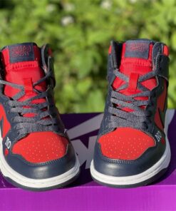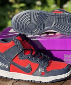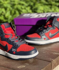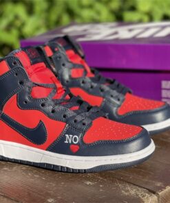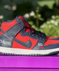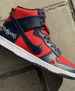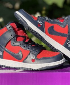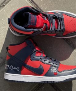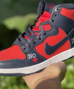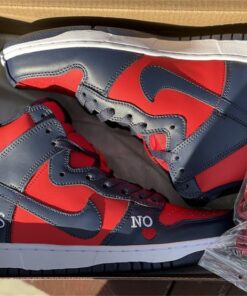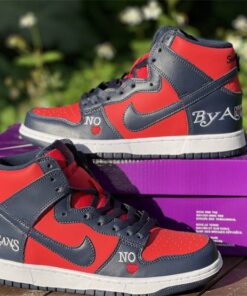 This Supreme x Nike SB DunK High gets constructed out of a full leather upper with red serving as the base color and navy placed all throughout the overlays as well as on the Swooshes, laces, and inner liner. Highlights include “By Any Means” written across the heels, NY with a red Swoosh also seen on the heels, “No ❤️” on the lateral forefoot, “SUP” Swoosh branding on the tongues, “Supreme Team” embroidery on the back ankle, and “World Famous” written on the lace tips.