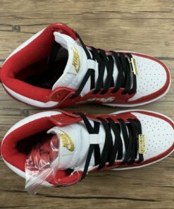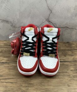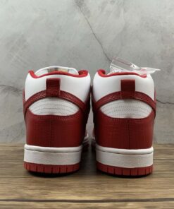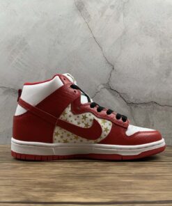 In collaboration with Supreme, this Nike SB Dunk High wears a clean white leather upper that’s paired with premium faux croc skin overlays in red, a star motif on the quarter panels and Supreme lace locks at the forefoot.