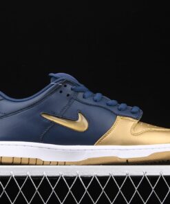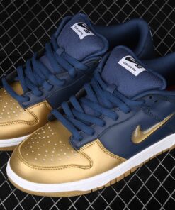 In collaboration between Nike SB and Supreme is a new Dunk Low boasting a navy leather upper that’s contrasted by a metallic gold toe panel, a Supreme star logo on the heel and jewel swoosh branding on the sides.