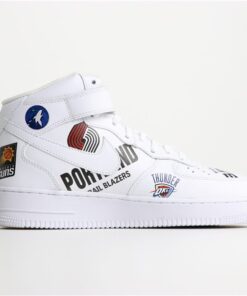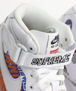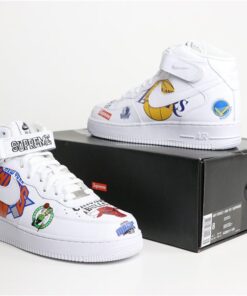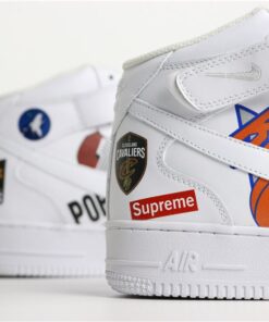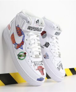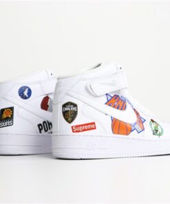 The range consists of black and white colorways of the Nike Air Force 1 Mid, three warm-up jackets, two jerseys, and two pairs of basketball shorts. Inspired by the infamous leather jackets and denim from the late ’90s and early 2000s, each piece is covered with official NBA team logos and Supreme box logos. Black and white sets of jerseys and shorts match each pair of Air Force 1 Mids. The jacket will release in black and white as well as a blue denim option. Despite previous reports, it does not look like a third blue colorway of the Air Force 1 Mid will be dropping.