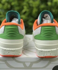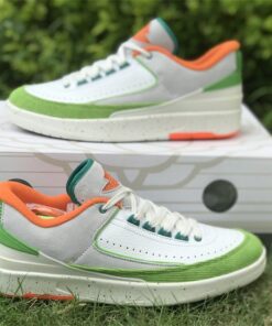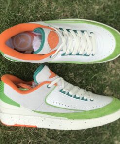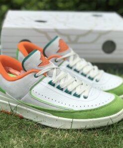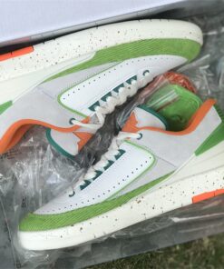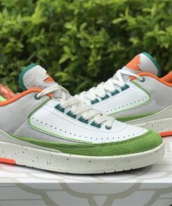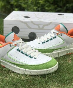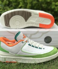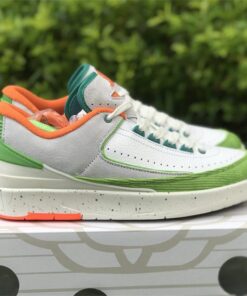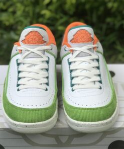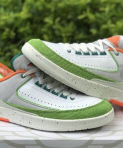 Dressed in a Sail, Safety Orange, Chlorophyll, and Coconut Milk color scheme. This offering of the low-top Air Jordan 2 features a White leather base with Grey suede overlays and Chlorophyll Green corduroy mudguards. Other details includes Orange accents on the sockliner and Jumpman tongue logo, while hits of Teal appear on the eyelets and lip of the tongue. A speckled midsole atop a Sail rubber sole with a custom Titan-branded hangtag completes the design.