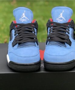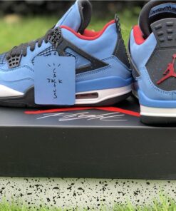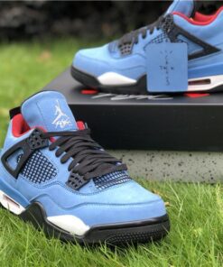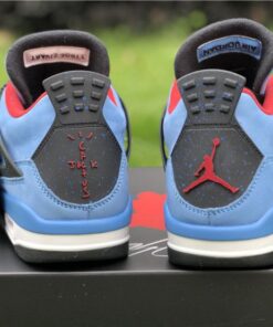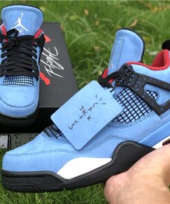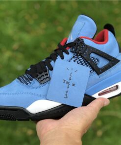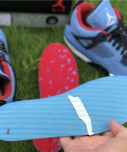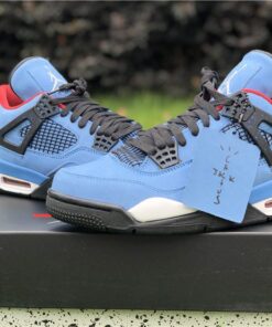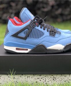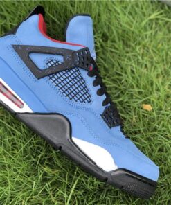 Dressed in a University Blue, Varsity Red, and Black color scheme inspired by his favorite pro football team from when he was a kid, the Houston Oilers. This Air Jordan 4 features a smooth suede upper with Cactus Jack, his record label, branding on the left heel and right insole and a reverse Travis Scott tag on the inner left tongue to nod to original Jordan 4 details.