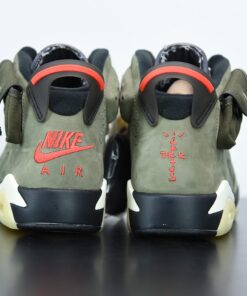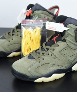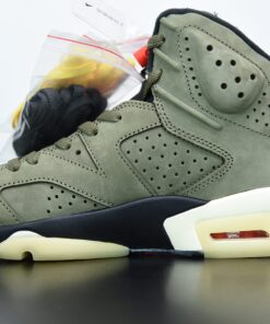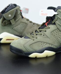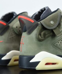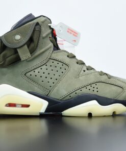 Dressed in a Medium Olive, Black, Sail, and University Red color scheme. This Air Jordan 6 features an Olive-based upper with Black detailing and Red contrasting accents. A side pocket on the collar, Sail midsole, glow-in-the-dark translucent outsole, 3M detailing and both Nike Air and Cactus Jack branding completes the design.