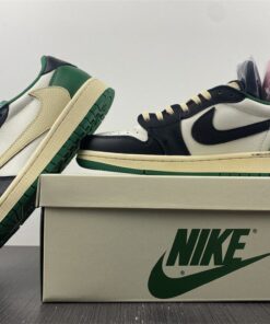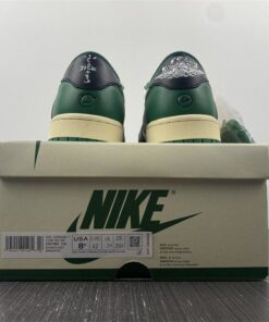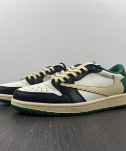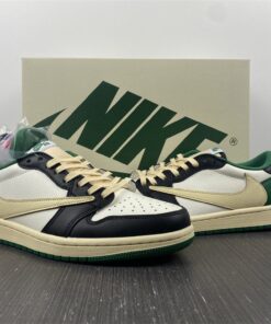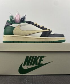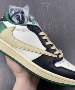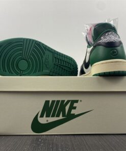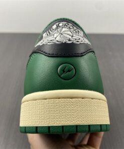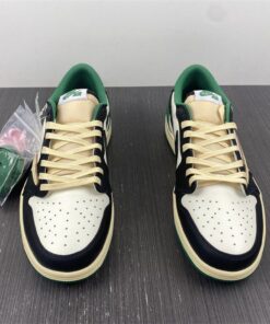 The Travis Scott x Fragment x Air Jordan 1 Low OG Green White Black is a highly coveted collaboration sneaker featuring a unique design that combines elements from three iconic brands. With a sleek green, white, and black colorway, this shoe is sure to turn heads and elevate any streetwear look. Made with premium materials and expert craftsmanship, this limited edition sneaker is a must-have for any sneakerhead or fashion enthusiast.