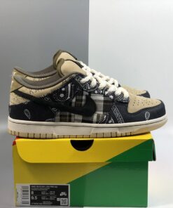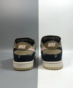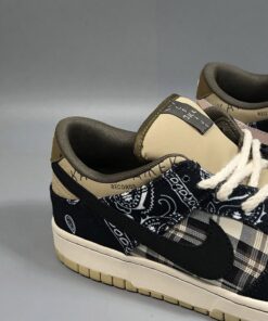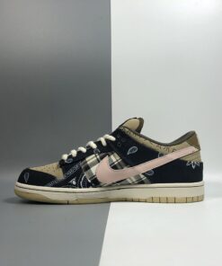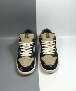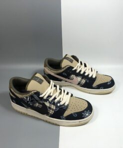 This SB Dunk Low sports an earthy base with Navy accents, while utilizing both paisley – which wears off to reveal a cement/elephant print underneath, and plaid prints. Embroidered text around the collar, rope laces, and Scott’s Cactus Jack logo on the puffy tongues completes the design.