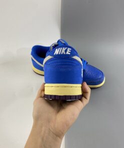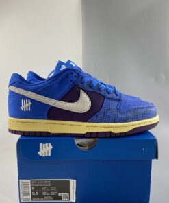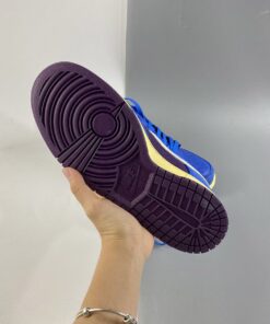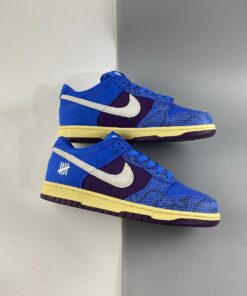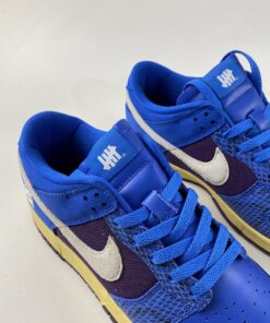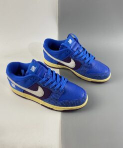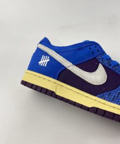 This pair features a Blue base, snakeskin overlays on the toe and eyestay, Purple panels paired with White suede Swooshes and Five Strikes logo on the lateral heel. A Purple insole marked with “Dunk vs AF-1” branding completes the design.