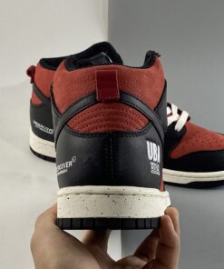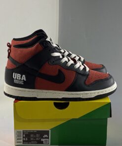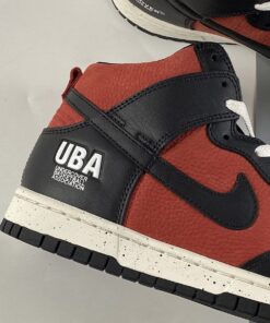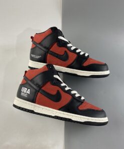 Dressed in a Gym Red, White, and Black color scheme. This offering of the Nike Dunk High features a Red leather upper with Black overlays atop a speckled White midsole and solid White rubber outsole. “UBA/Undercover Basketball Association” branding on the lateral ankle, traditional Undercover text appears on the medial side with co-branded insoles completes the design.