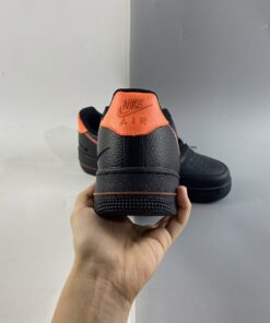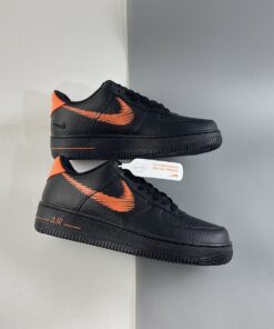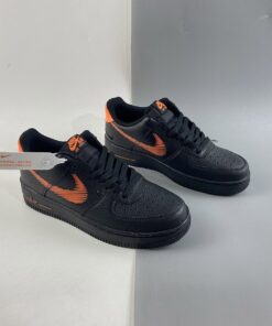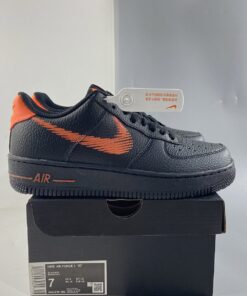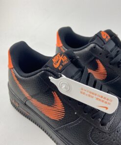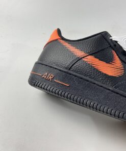 This offering of the Nike Air Force 1 comes dressed in a similar color palette as the VLONE Air Force 1. The shoe features a Black tumbled leather upper highlighted with Orange pops on the zig-zag Swooshes, heels, tongue, insole and midsole branding. Black laces, nylon tongues, liner, and rubber AF1 sole completes the design.
