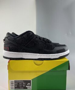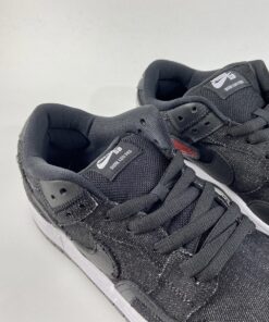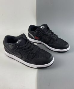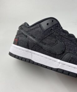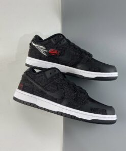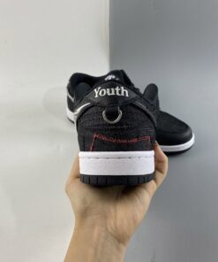 This Wasted Youth offering of the Nike SB Dunk Low comes with a patchwork design featuring a Black denim-like upper with leather overlays and square patches on the forefoot. Additional details includes a removable Swoosh on the lateral that exposes an outline of the logo in White, exposed Red stitching, a rose embroidered graphic on the medial, “Wasted” and “Youth” branded heels with metallic rings hanging below the heel tab. A White midsole atop a Black rubber outsole and text branded insoles completes the design.